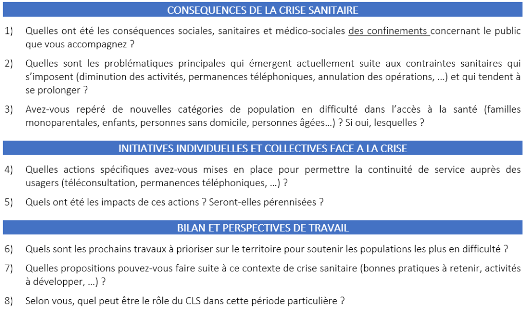Le questionnaire était constitué de 8 questions réparties sous 3 thématiques : les conséquences de la crise sanitaire, les initiatives individuelles et collectives face à la crise et, le bilan et les perspectives de travail.