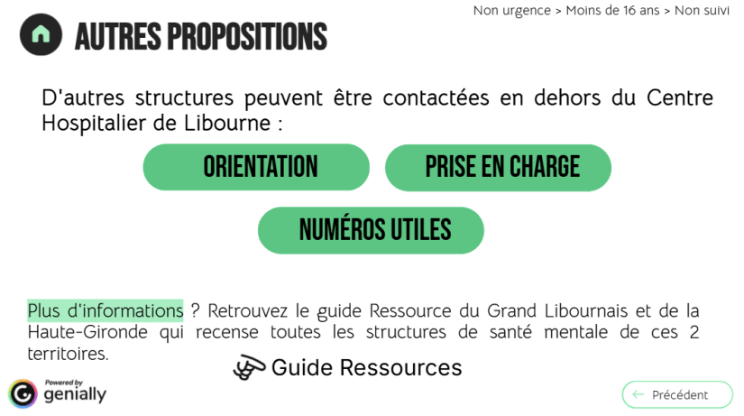 L’outil a également vocation à orienter les partenaires vers des structures hors psychiatrie de secteur en proposant par exemple une liste de psychologues et de psychiatres du territoire ainsi que des annuaires ou numéros utiles.