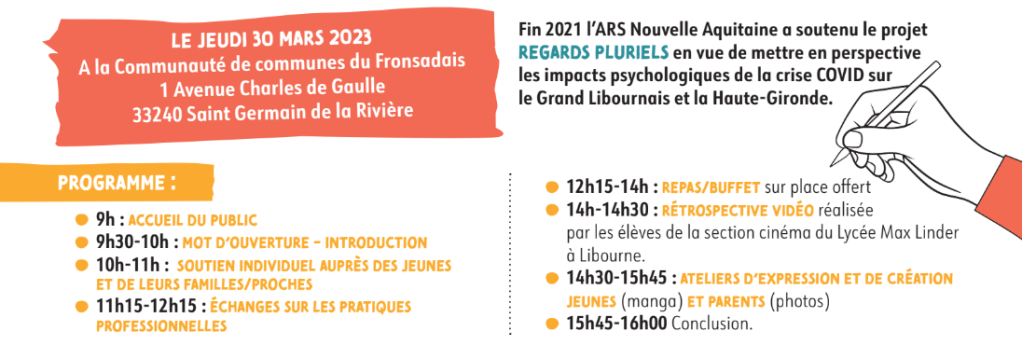 Le bilan du projet Regards Pluriels a été présenté le jeudi 30 mars 2023 à Saint-Germain-de-la-Rivière devant plus d’une cinquantaine de participants. La journée a été riche d’échanges et de propositions, elle permet de clotûrer ce projet portée par le Réseau Santé Social Jeunes du Libournais en partenariat avec le Contrat Local de Santé Haute-Gironde.