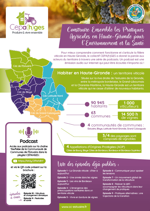 Les partenaires du projet CEPA(h)GES ont souhaité produire une brochure d’informations destinée aux habitants de Haute Gironde afin de mieux faire connaître les pratiques viticoles pour améliorer le vivre ensemble et pour donner les informations nécessaires en cas de problèmes. Cette brochure est disponible dans toutes les mairies.