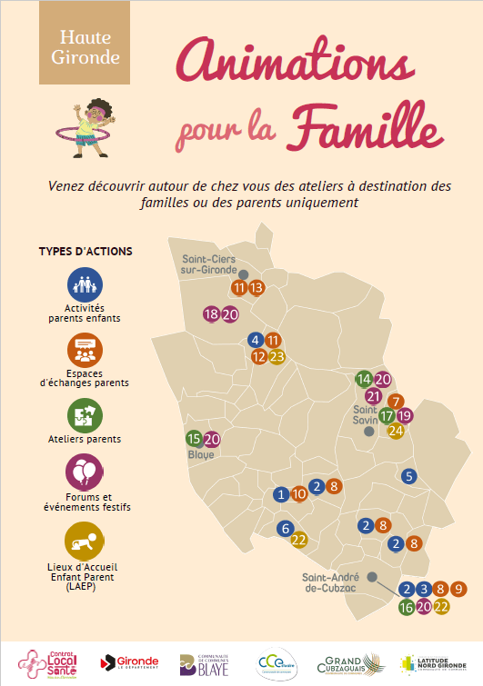 En complément de la plaquette sur les dispositifs d’accueil, les partenaires ont souhaité également mettre en avant sur le territoire tous les ateliers existants à destination des familles ainsi que les ateliers réservés aux parents. Cet outil permet aux parents d’identifier rapidement les animations existantes autour de chez eux.