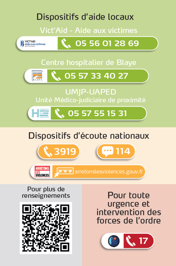 L’affiche « Victime de violences intrafamiliales ? » répertorie l’ensemble des numéros utiles de la Haute-Gironde dont celui de l’intervenant social en gendarmerie. Cet outil est à destination du tout public et il peut être affiché par tout professionnel du territoire dans son établissement.