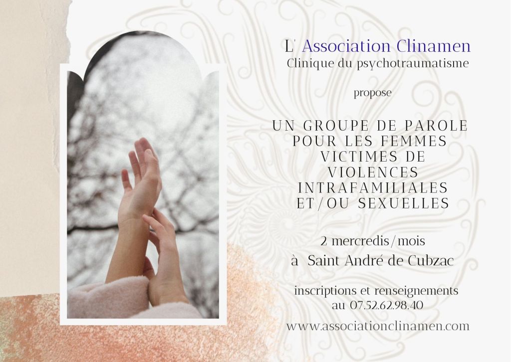 L’association propose un groupe de parole pour les femmes victimes de violences intrafamiliales et/ou sexuelles 2 mercredis par mois à Saint-André-de-Cubzac.